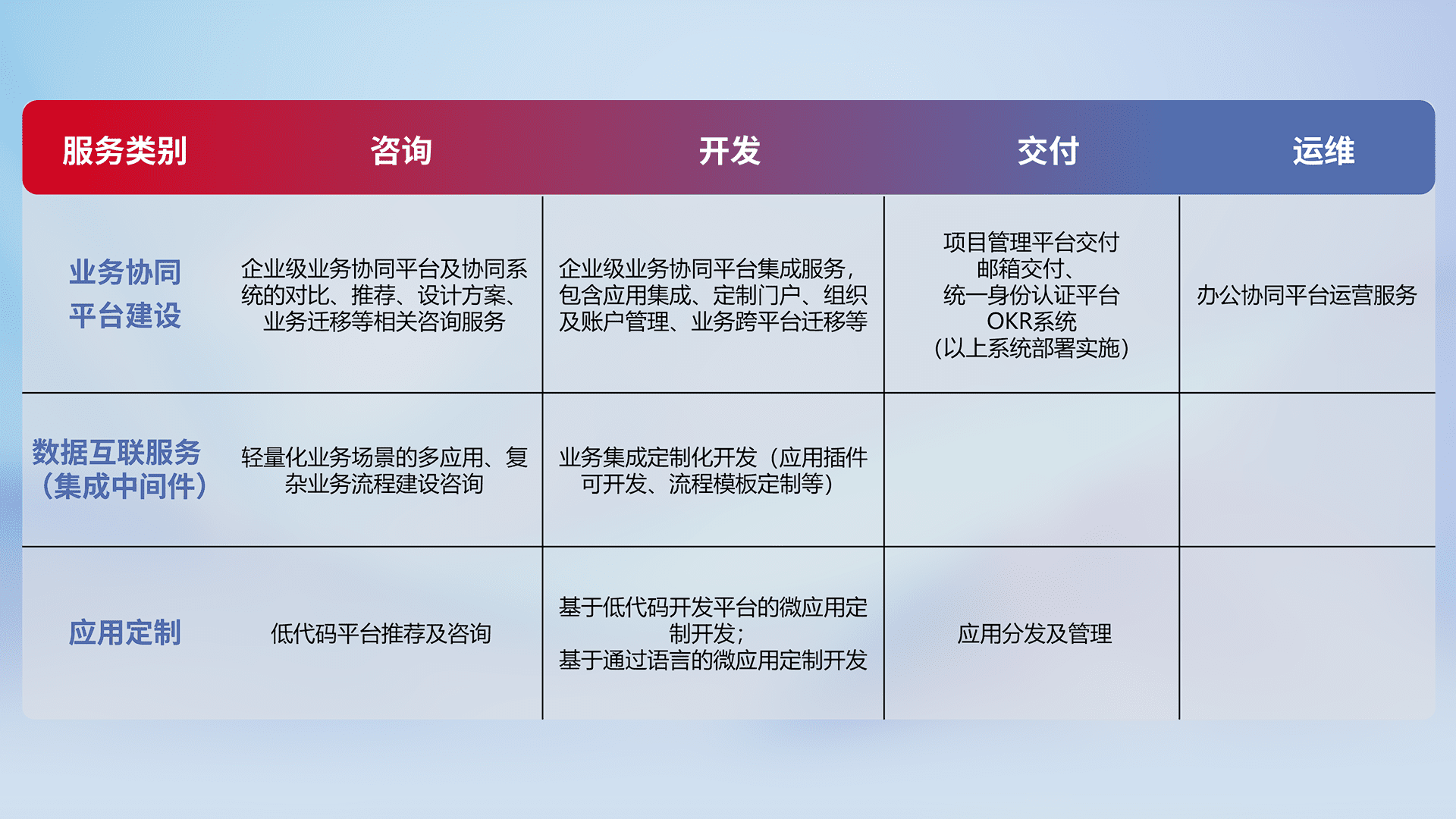 针对钉钉、、、、企微、、、、IDaas等平台级产品提供产品的规划、、、、方案、、、交付、、定制化开发等服务,,,,实现如统一协同办公、、、智能客户服务、、、、混合会议管理、、智能数据查询、、、等业务场景,,,,实现数字化转型。。。。